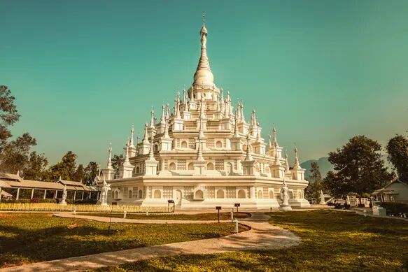 大金塔的对面,有一座【勐焕银塔】,誉为勐焕万佛银塔,坐落在大金塔对面的山顶上。一金一银,遥遥相望。银塔建筑以纯白为基调,与勐焕金塔在色彩上形成鲜明对比,两塔屹立在雷崖让山之巅,一个雍容华丽,一个典雅素静,相映成趣。