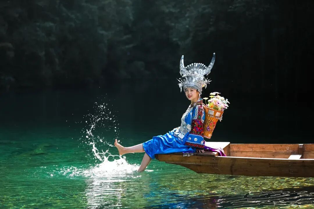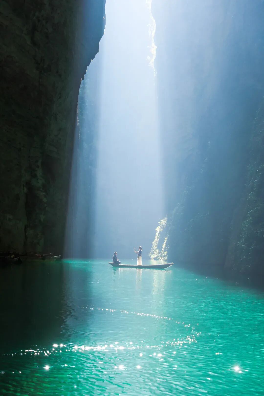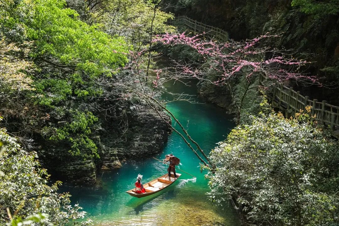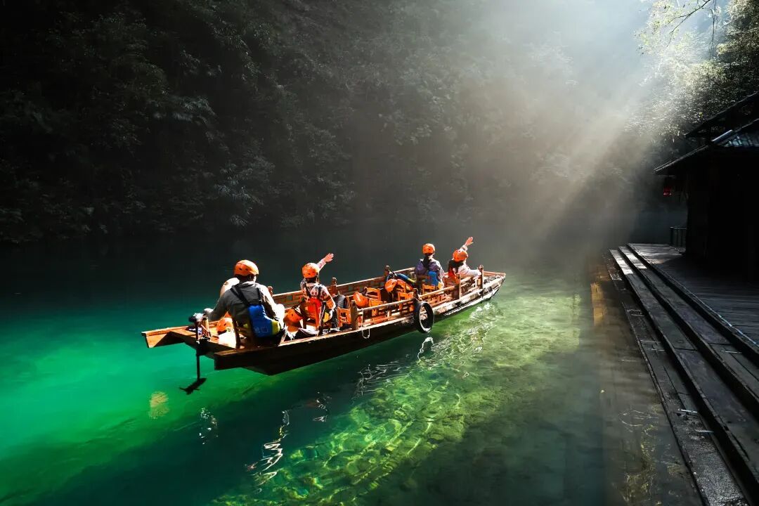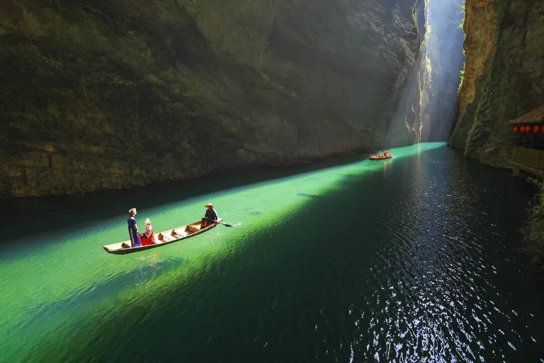 屏山地形奇特,整体呈狭长弧形地势,四周峭壁耸立,碧水穿梭其中,清澈见底,船行河面恰逢一束阳光从峡谷上方洒下,在河面形成暗色投影,船只犹如悬浮在半空中。逢此天工美景,你脑补的我们都想到了,端坐在木船之上倾国倾城不倾船。作为一个真正的戏精,请时刻保持镜头感,来给个V,我保证看不出来是摆拍