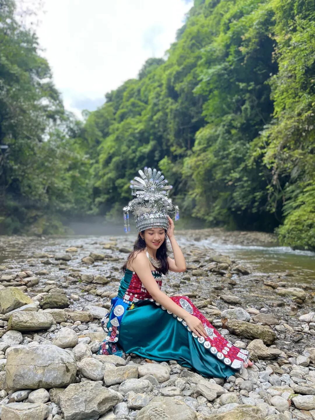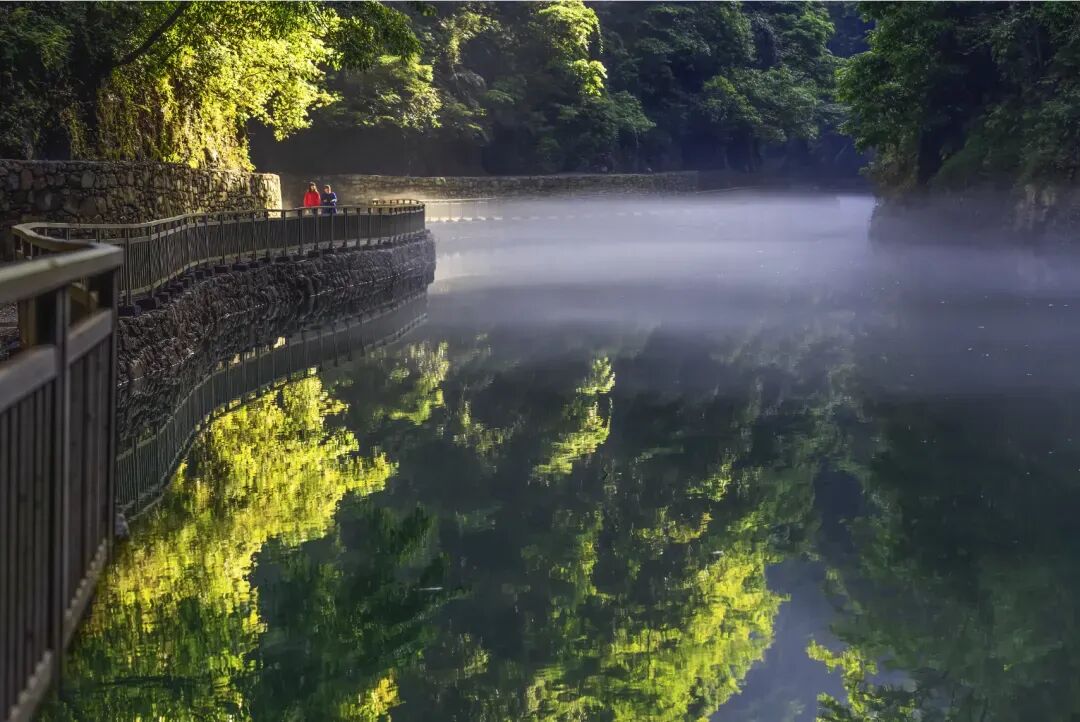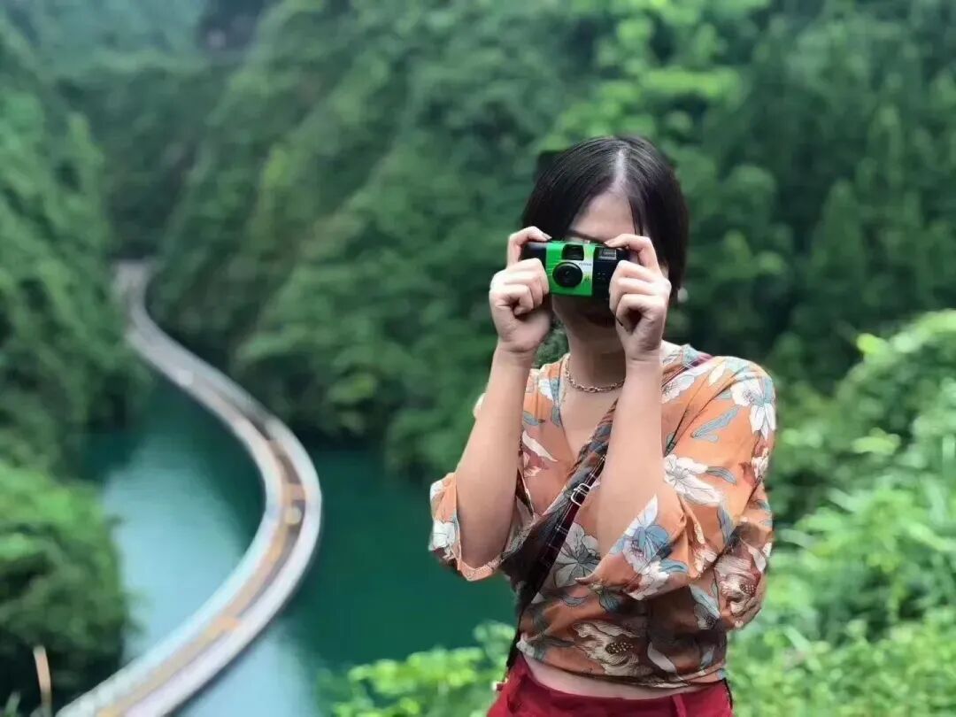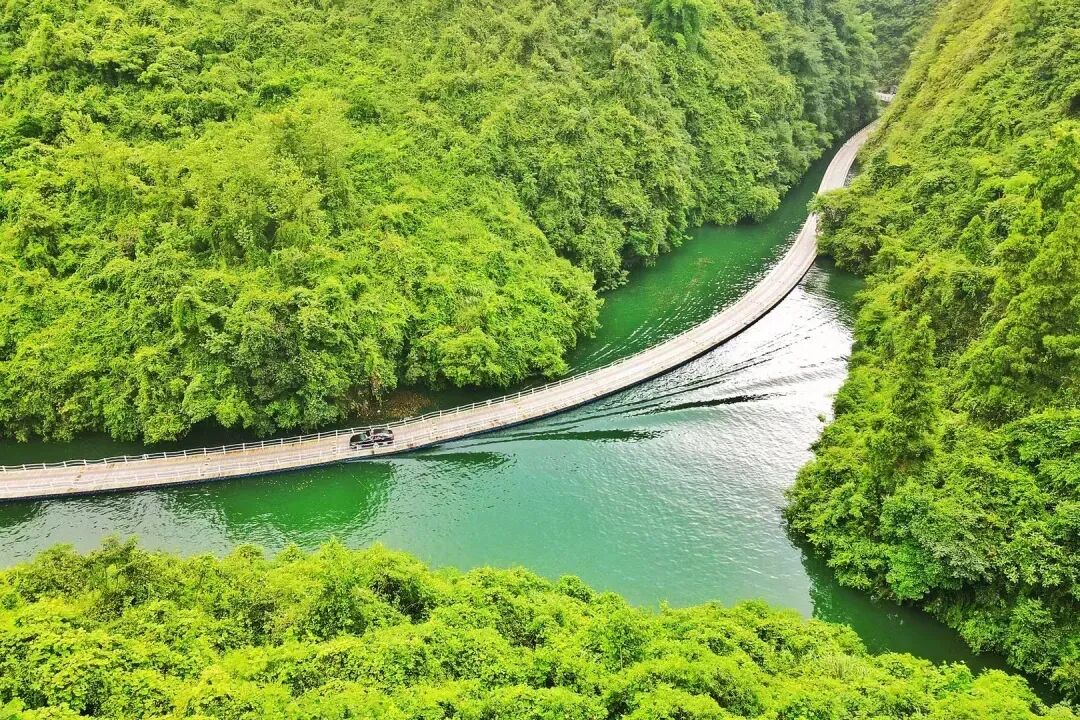 屏山地形奇特,整体呈狭长弧形地势,四周峭壁耸立,碧水穿梭其中,清澈见底,船行河面恰逢一束阳光从峡谷上方洒下,在河面形成暗色投影,船只犹如悬浮在半空中。逢此天工美景,你脑补的我们都想到了,端坐在木船之上倾国倾城不倾船。作为一个真正的戏精,请时刻保持镜头感,来给个V,我保证看不出来是摆拍