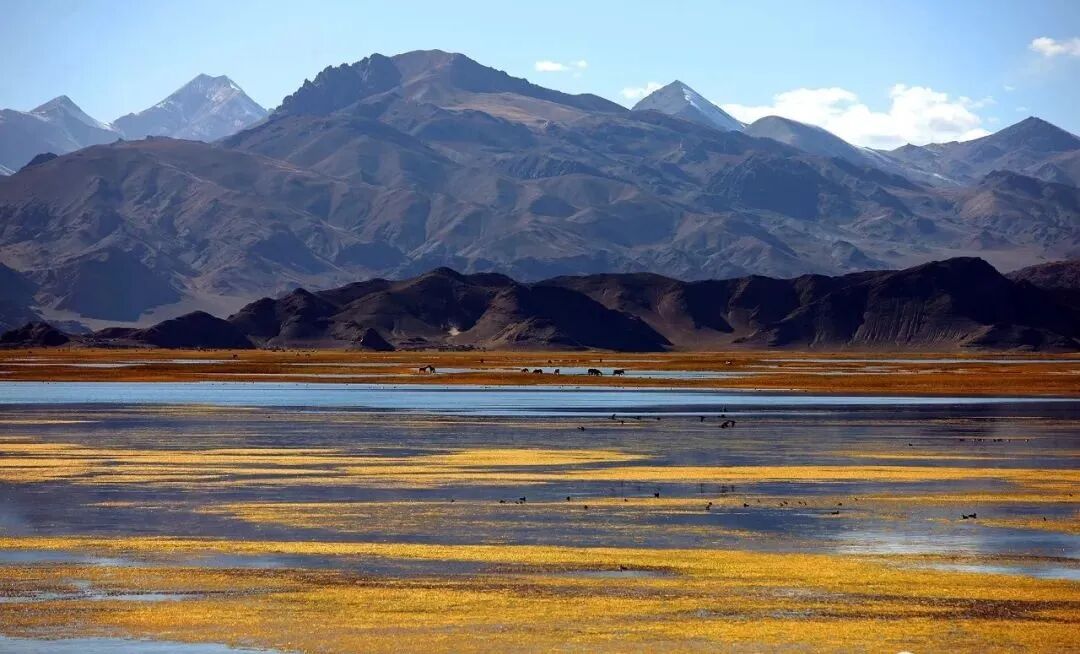 国际湖泊班公湖,水色绚烂,金黄的水草在湖中摇曳生姿。