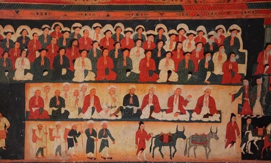 古格红殿的壁画描绘了一幅庆典画面,画面中,有南亚装扮的乐手以及戴着面具的舞者,衣着发型各异的各邦人士前来观礼,场面热闹欢乐,形象生动活泼。