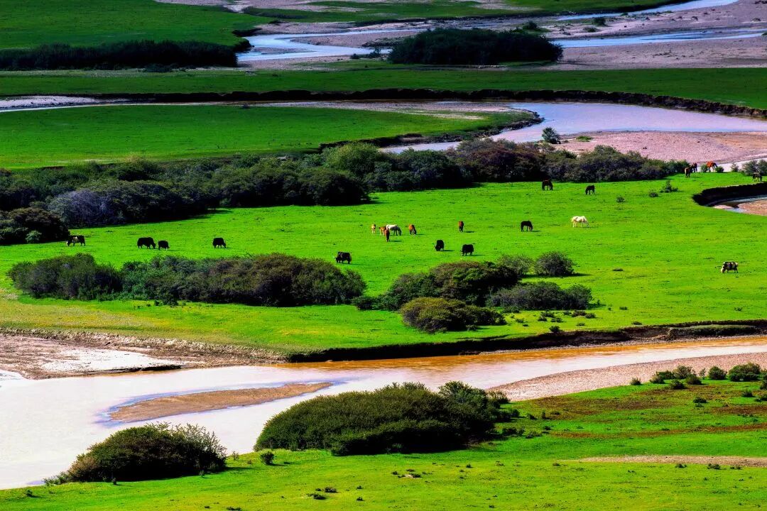群山环抱之中,如海的草原郁郁葱葱,牛羊成群,绿草连天