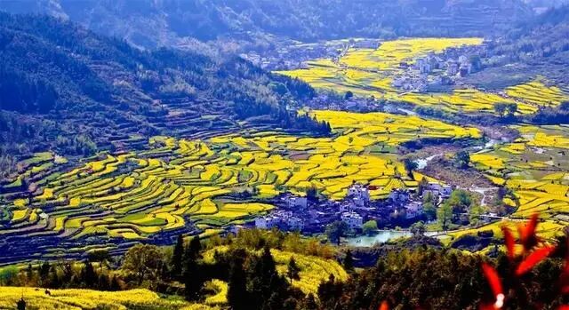 中国四大花海之一的江岭,万亩水稻成熟,金黄的稻浪摇荡在层层叠叠的梯田中,分布在粉墙黛瓦的青郭外,构成一幅绝美田园丰收图画。