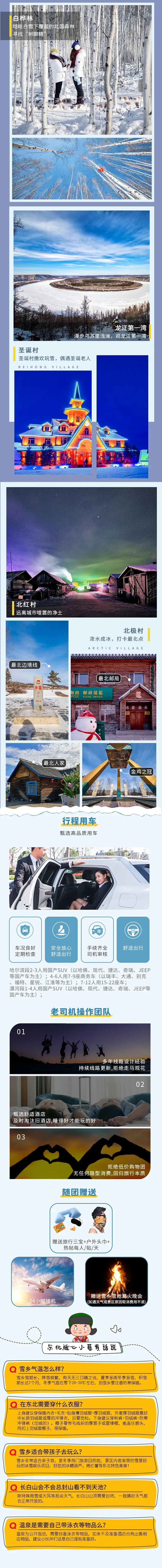 4、门票:亚布力+漠河2小时滑雪包含雪鞋雪板雪杖使用、雪乡门票+往返环保车、长白山门票+往返环保车、九曲十八弯门票、龙江第一湾门票、圣诞村门票、北极村门票、鄂温克驯鹿园;