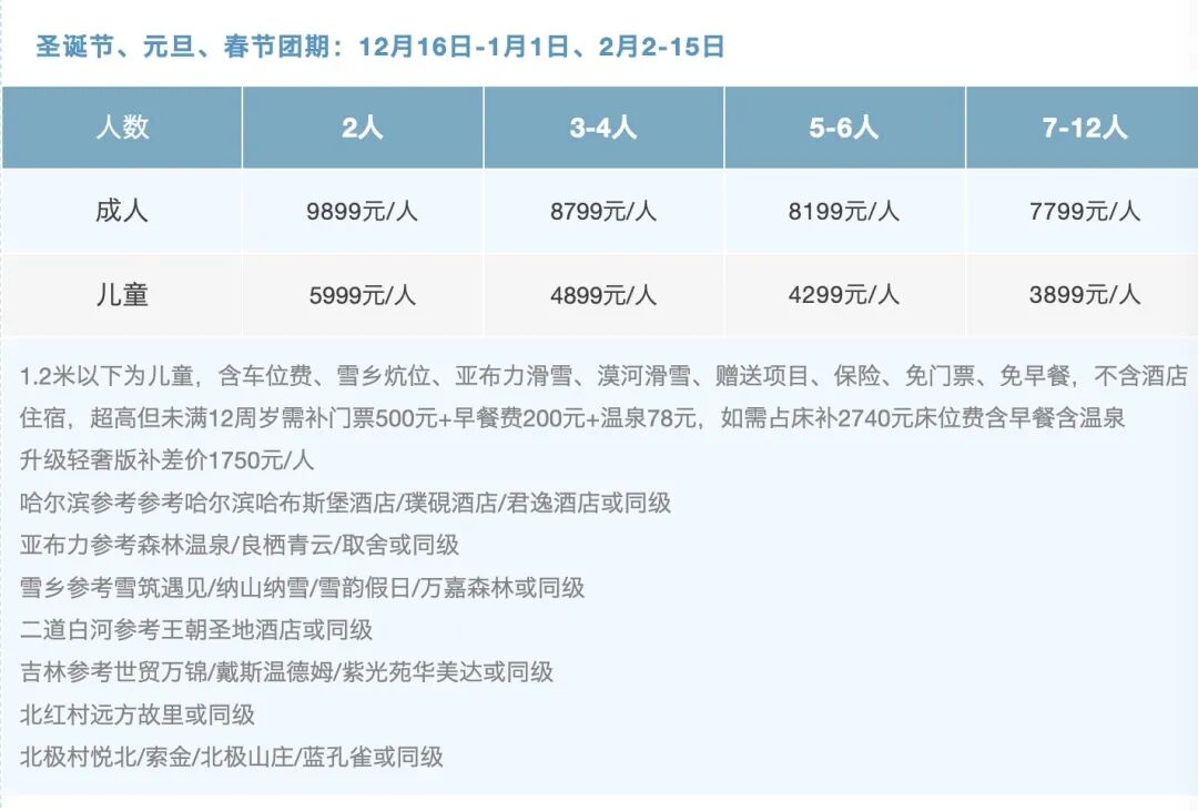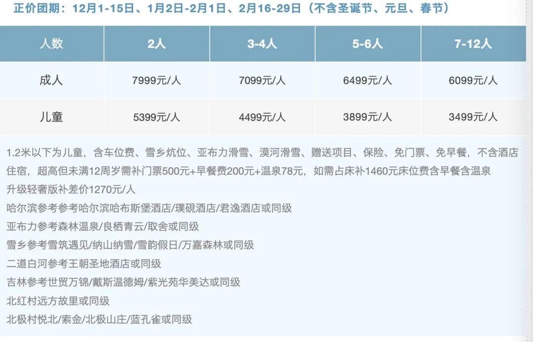 1、住宿:哈尔滨精品型酒店双标间1晚,亚布力商务型酒店双标间1晚,雪乡双人间独立卫浴农家炕1晚,二道镇精品型温泉酒店双标间1晚,吉林精品型酒店双标间1晚,北红村家庭农家炕双人标间独立卫浴1晚、北极村家庭旅馆或农家炕双人标间独立卫浴1晚;