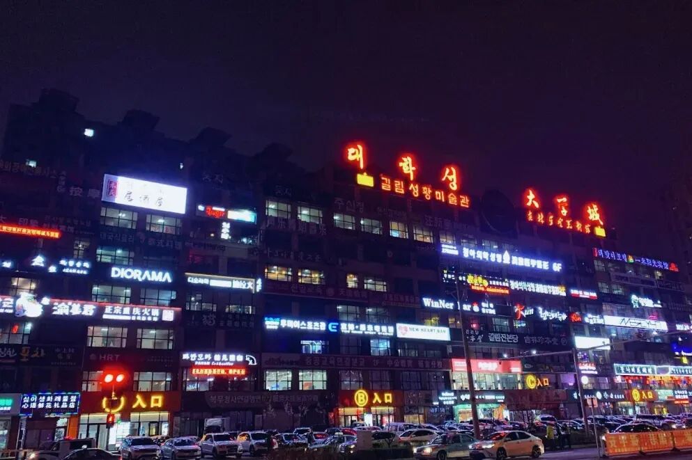 16:30 夜幕降临延边大学正门对面的【网红弹幕墙】,算是延吉目前的标志性地标了,前来拍照打卡的人络绎不绝。尽管延边大学内部不可以进入,但对面的这面墙却格外吸睛,尤其是晚上灯光亮起霓虹闪耀,地方独有的异域感很强。于2022年入选“吉”字号网红打卡地。