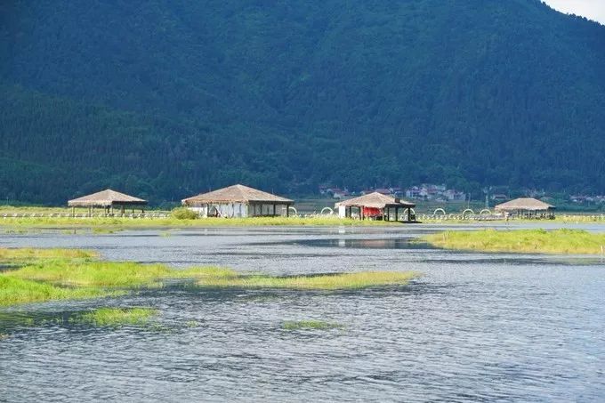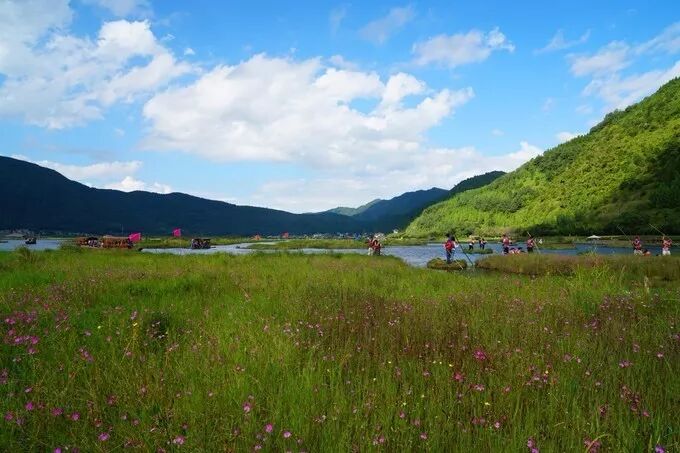 这里四面环山,水面漂浮着各种花海草海,分不清是草原还是湖泊,犹如五彩缤纷的巨型花毯,绚丽神奇。