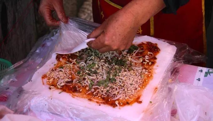 整张米皮刷上自制酱、铺豆芽、黄瓜丝、烧肉丝和酥肉,熟练卷起,一口下去,酸辣咸香,酥肉的香气满溢、口感非常丰富。