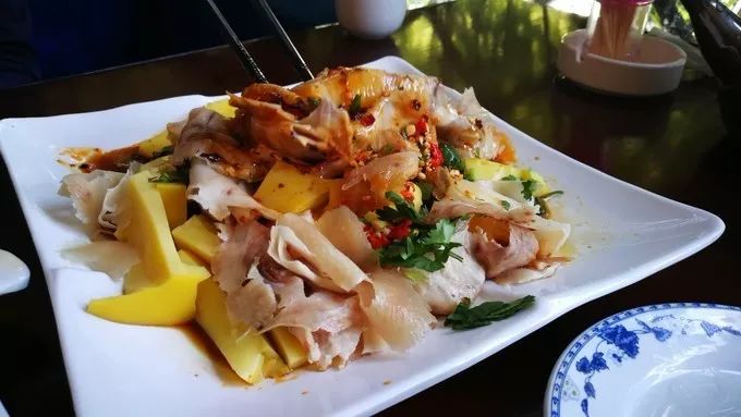 透明且薄如窗纸的猪肉片,煮熟放凉,沾上配好的佐料,口感清脆,醇香。