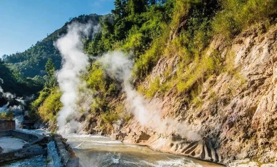 这里青山环抱,一水喧腾。桥下滚滚洪水,前方的袅袅白烟预示着温泉之处。
