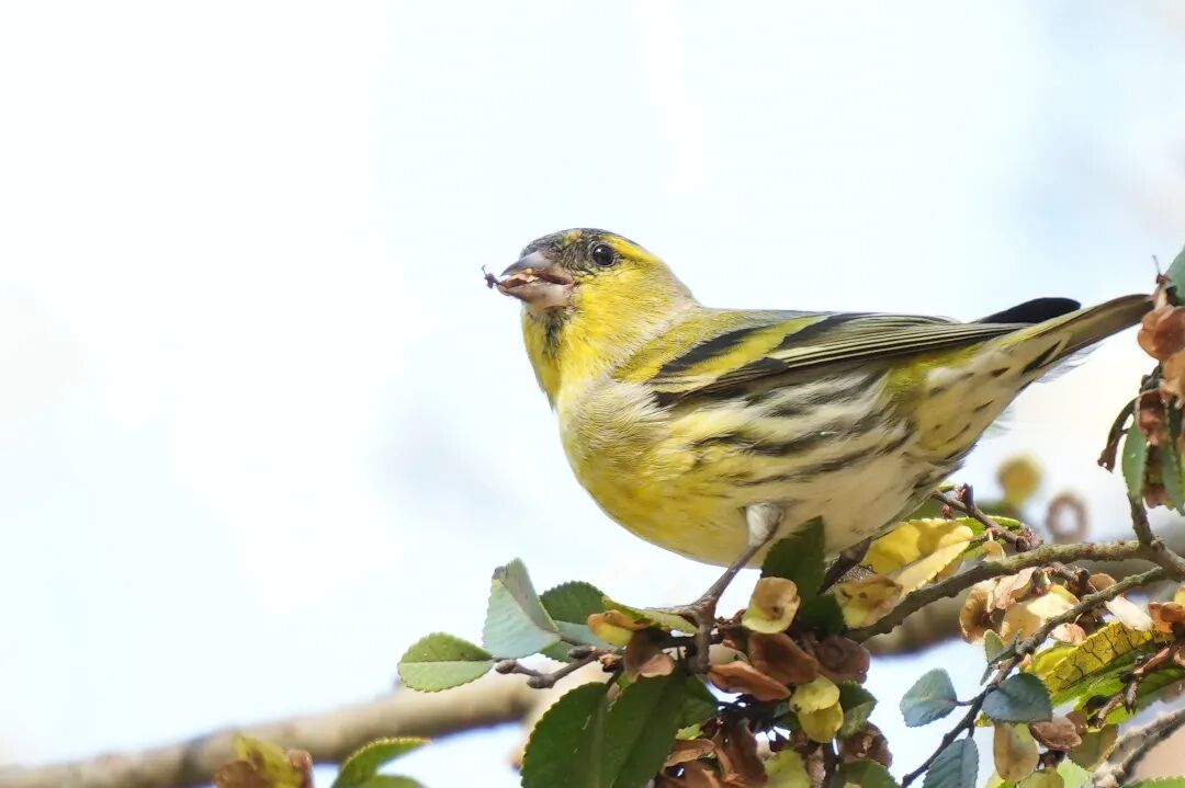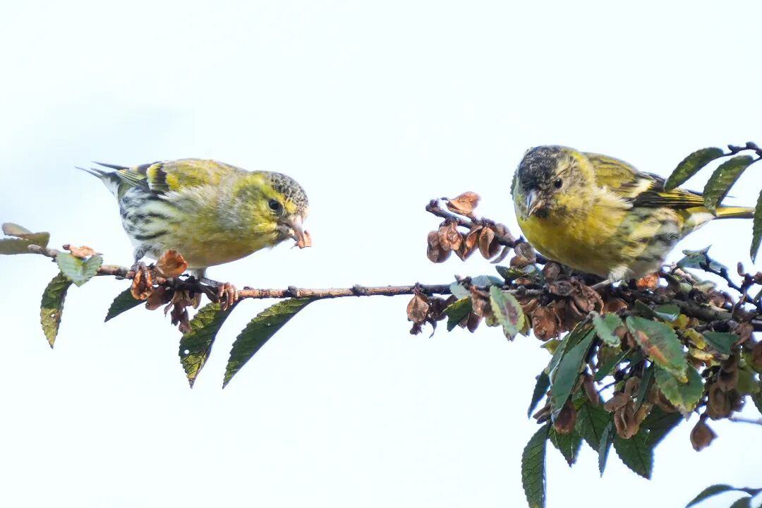 写停在植物枝条上觅食的黄雀