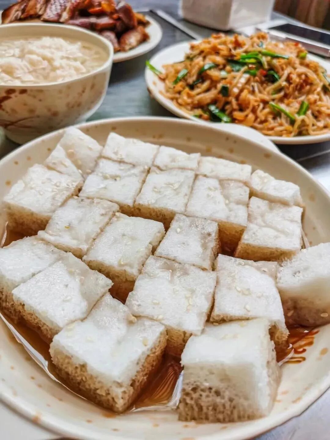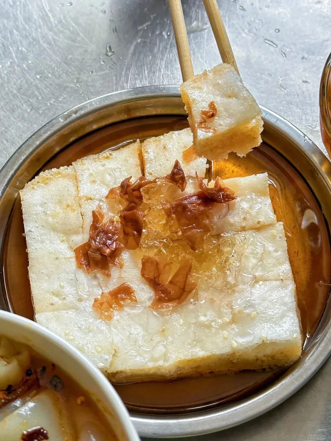 冷藏过后的米糕,混合着香甜可口的红糖水,再淋上馥郁清甜的玫瑰酱,撒上些许芝麻,吃起来松松软软,甜而不腻,还透着丝丝缕缕的冰凉……