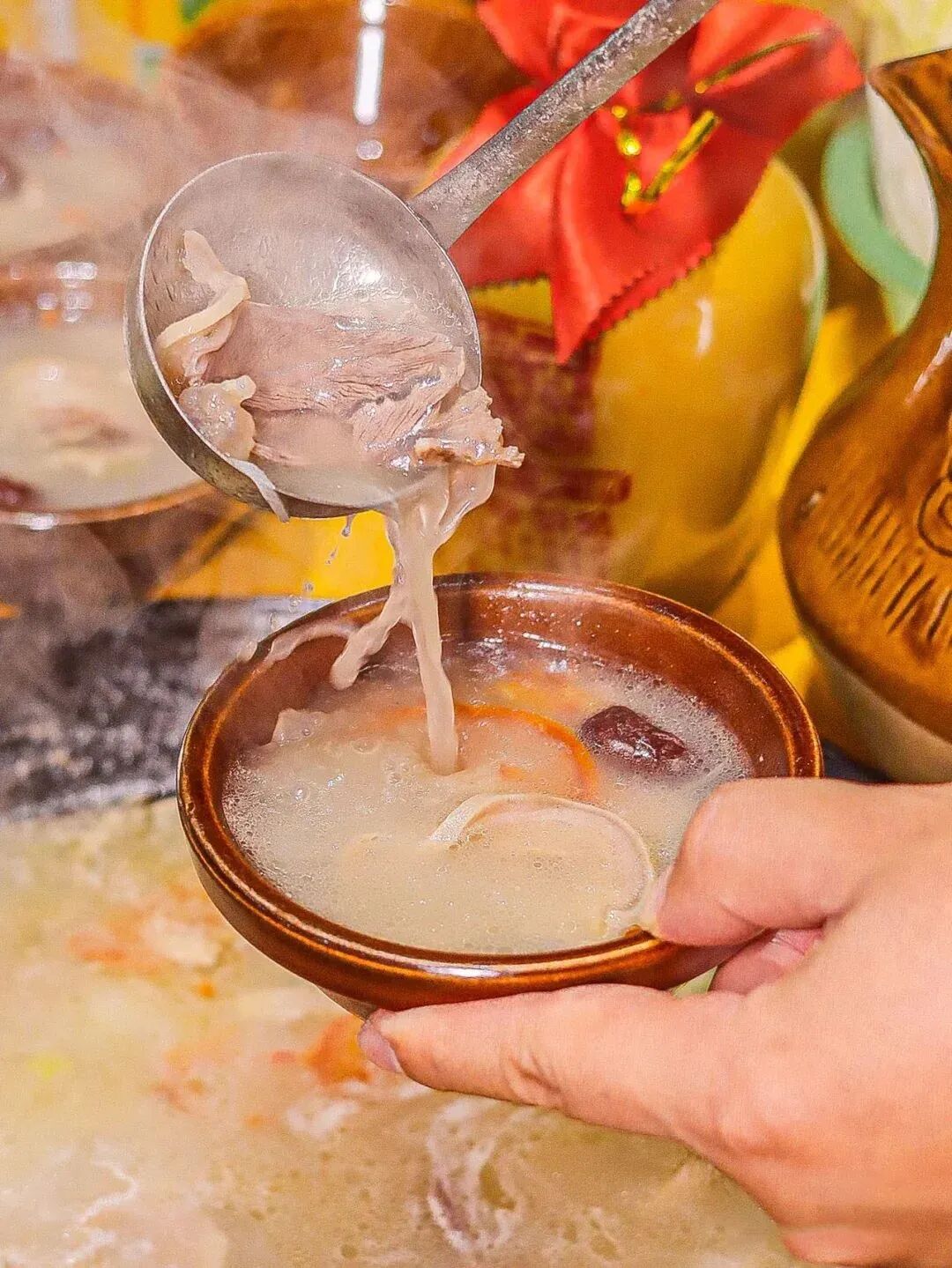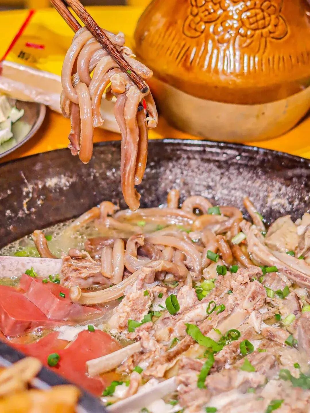 汤底也是颇有讲究的,一般用鸡汤或筒子骨汤,除了盐外不加任何调料,吃的就是这份原汁原味,吃一口热乎食物,聊几句闲话家常,温暖而又自在。