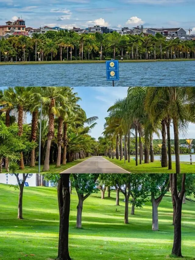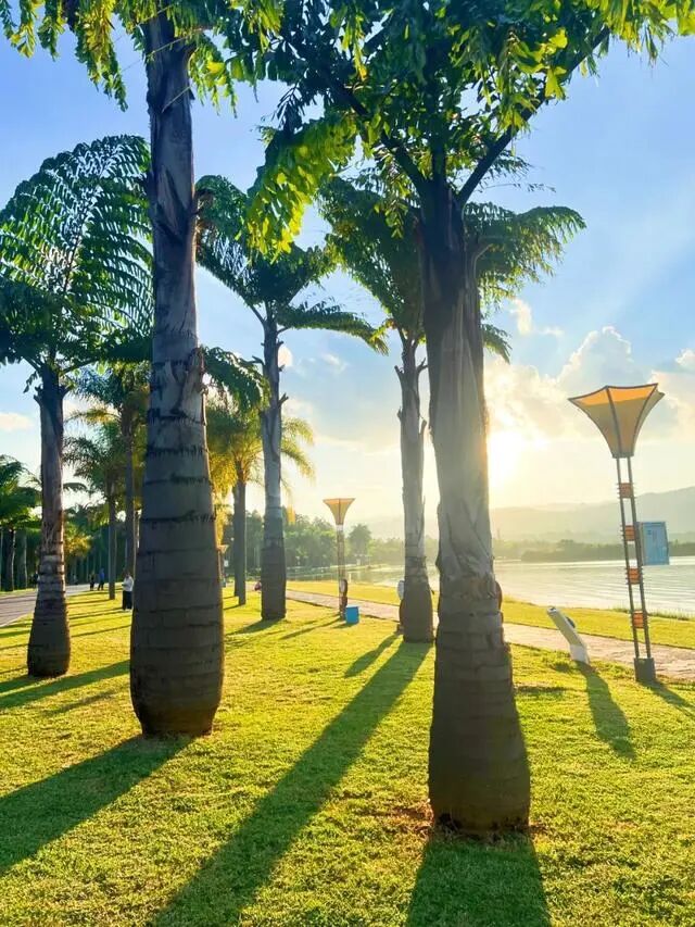 先走一走生态园,这有大片干净澄澈的湖泊,阳光大把的倾泻下来,两旁是摇曳的棕榈树,温暖明媚。