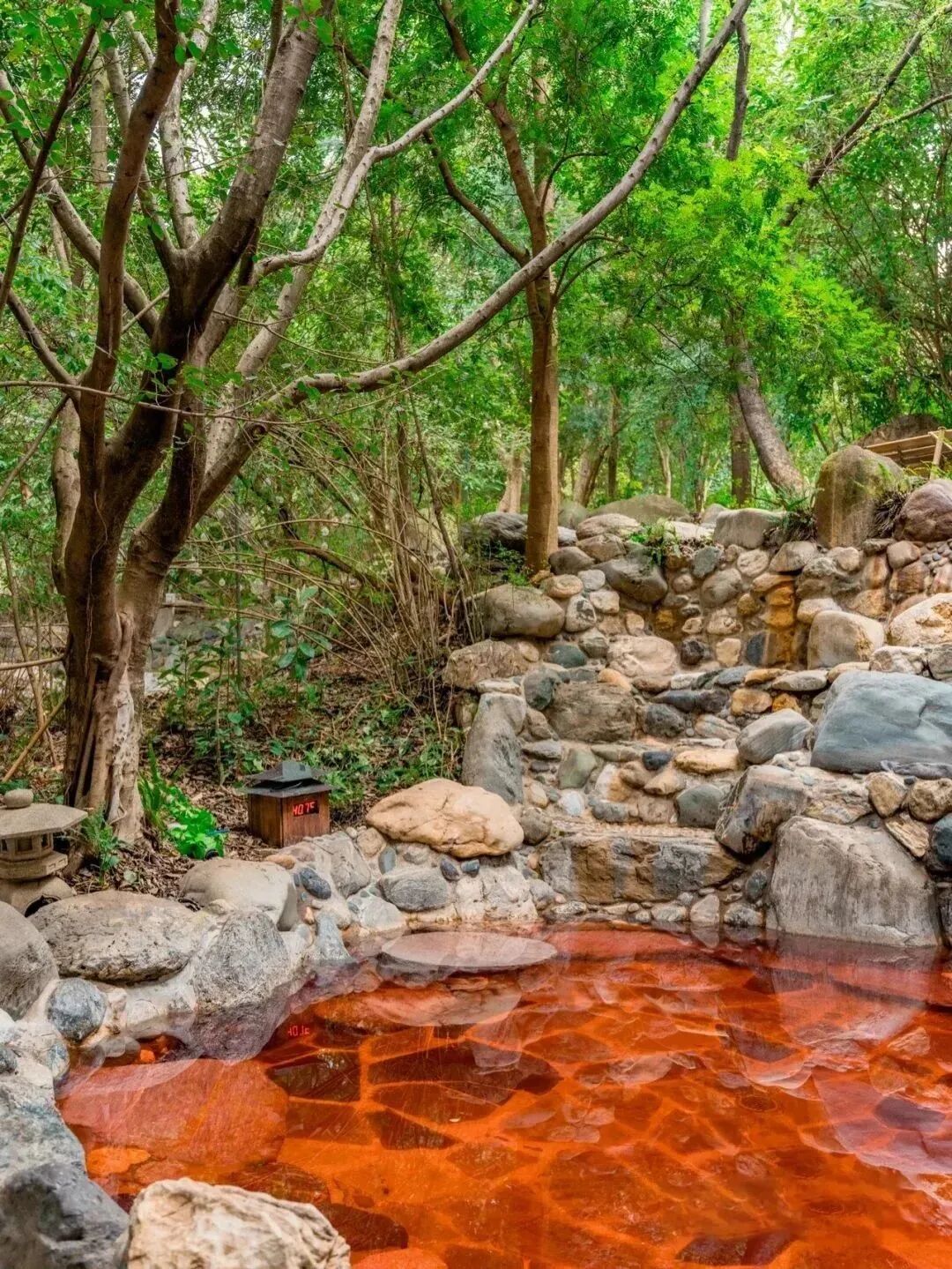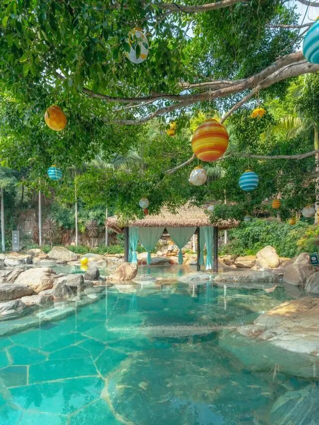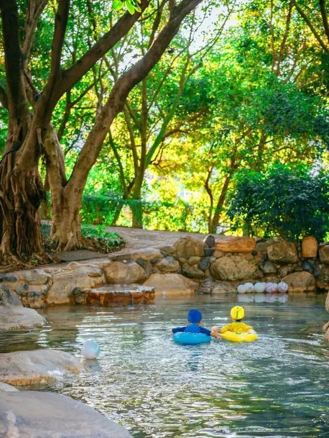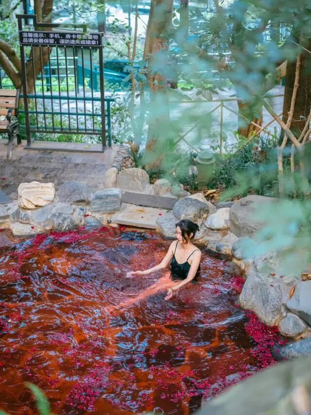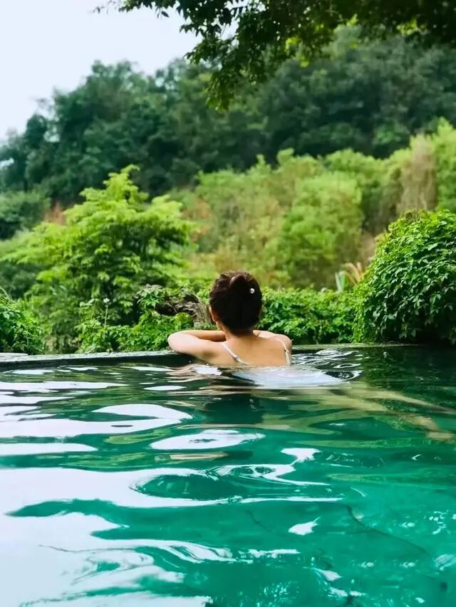 躺进温温热热的泉水之间,抬眼便是葱葱茏茏的林木环抱,一呼一吸间透着满满的清新。
