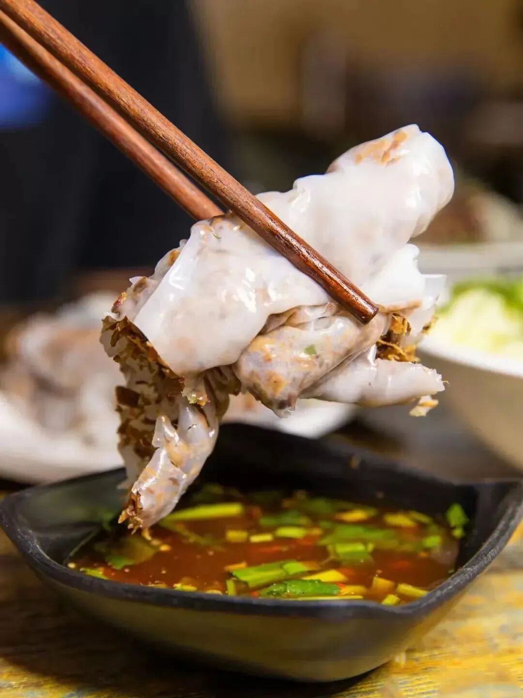 当地人也爱吃越南卷粉,管它叫“小卷粉”,洁白剔透的皮子里裹着若隐若现的满满馅料,再配上自行调配的花式蘸水,酸爽至极!