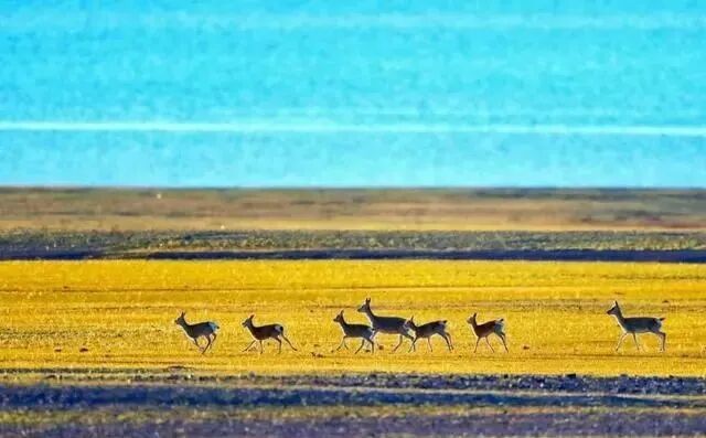 在夏日绿油油的湖边草地上,一队藏原羚出现在地平线上,它们奔跑着、跳跃着,在阳光下留下美丽的剪影,有如动画片中的动物,优雅、灵动,演奏着一曲高原之歌。