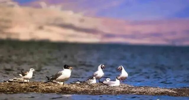 玛旁雍措是鸟类的天堂,夏日里,一群红嘴鸥在水中嬉戏,其中一对张大了嘴唧唧叫着,像是在争吵着什么,其他同伴对它们却熟视无睹,应该早已习惯了它们的吵架。