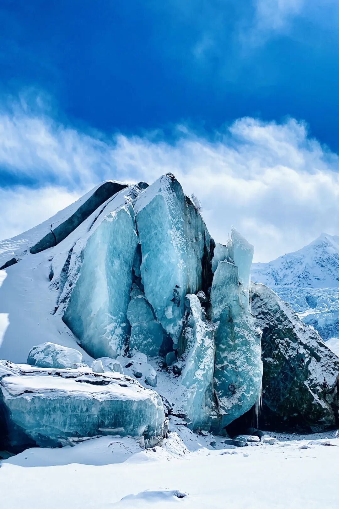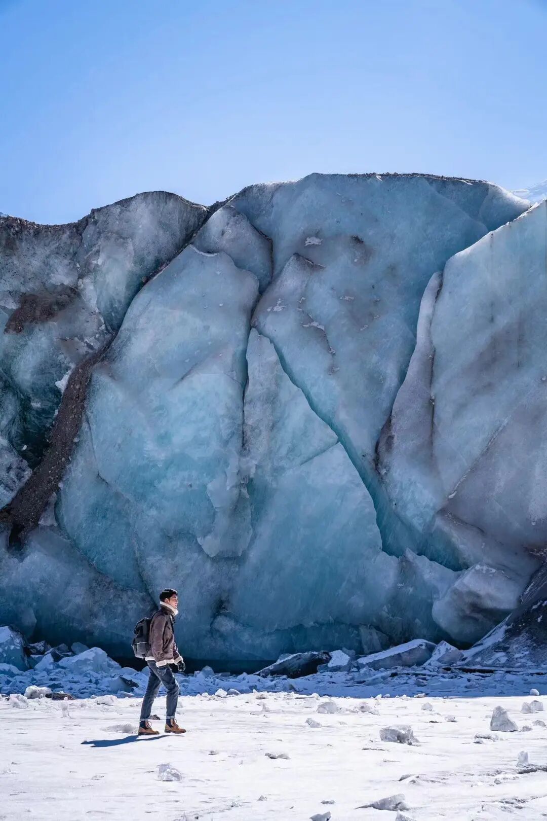 这里有宛如镜面的的冰面湖,有参差堆叠如仙境的冰塔林、深不见底的冰裂缝,也有幽蓝冰体围拱起的冰洞,阳光洒落,蓝金交相映耀,美得不似人间。