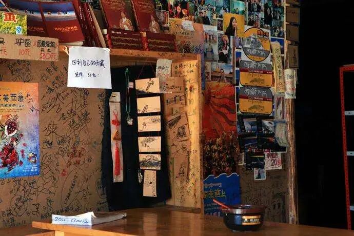 店内装修非常简单,木条柜台,木质方桌,粗犷而简陋,墙壁上密密麻麻贴满了游客留下的字条、卡片、照片,五颜六色非常漂亮。