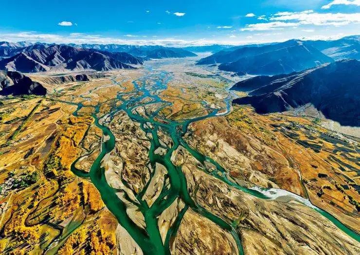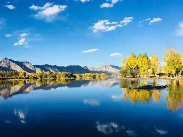 拉萨河象一条圣洁的哈达飘落在气势磅礴的布达拉宫前。阳光下,河水呈现出宝石般的湛蓝色,水面平静,河滩上的树木泛着金黄。