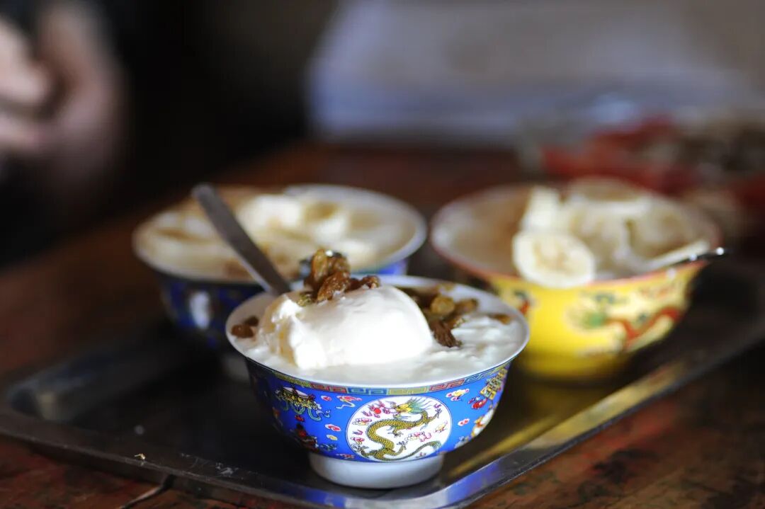 酸奶很纯很酸,每桌上都会有很大的糖罐子,可以随意添加白糖,点原味酸奶,铺上一层糖,吃掉后再来一层,砂糖嚼在嘴里发出吱吱的声音,也算是一种特色吧。