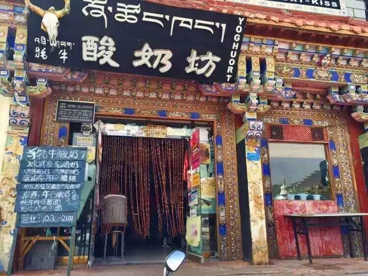 在布达拉宫西侧的停车场边,有一处从外观上看毫不起眼的酸奶坊,虽然它的外观是精美的藏式雕花,玻璃门上方挂着一块横匾,“酸奶坊”几个白色的大字十分醒目,上面还挂着一只牛头骨架。
