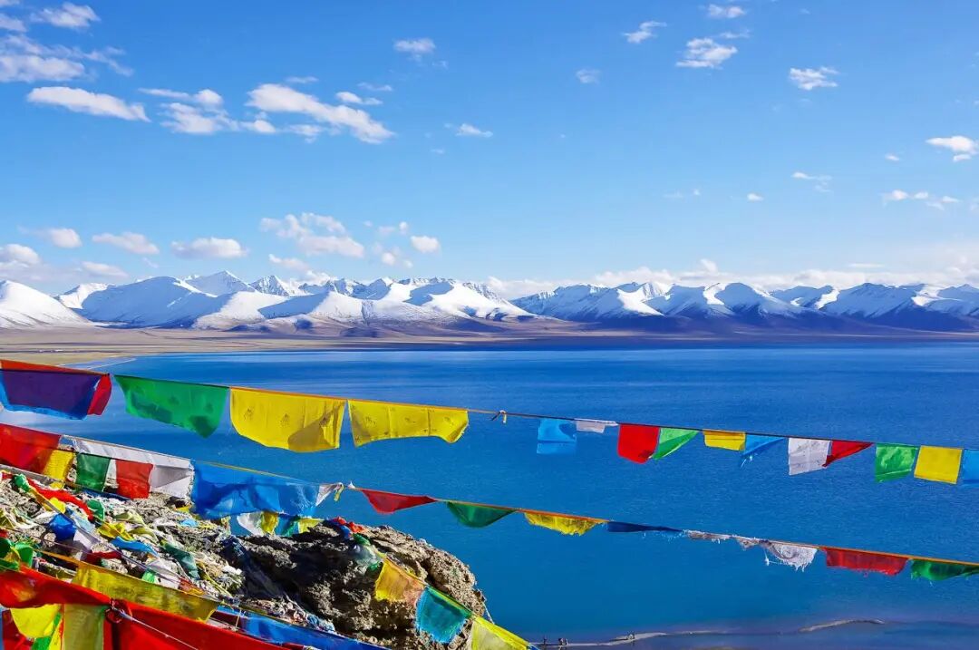在纳木错湖畔,玛尼堆上悬挂着蓝、白、红、绿、黄五种颜色的布条,它们随风飘动,白色牦牛、圣象天门,一望无际的草原环绕湖水的四周。千里湖面像一面巨大的宝镜,镶嵌在藏北草原上。