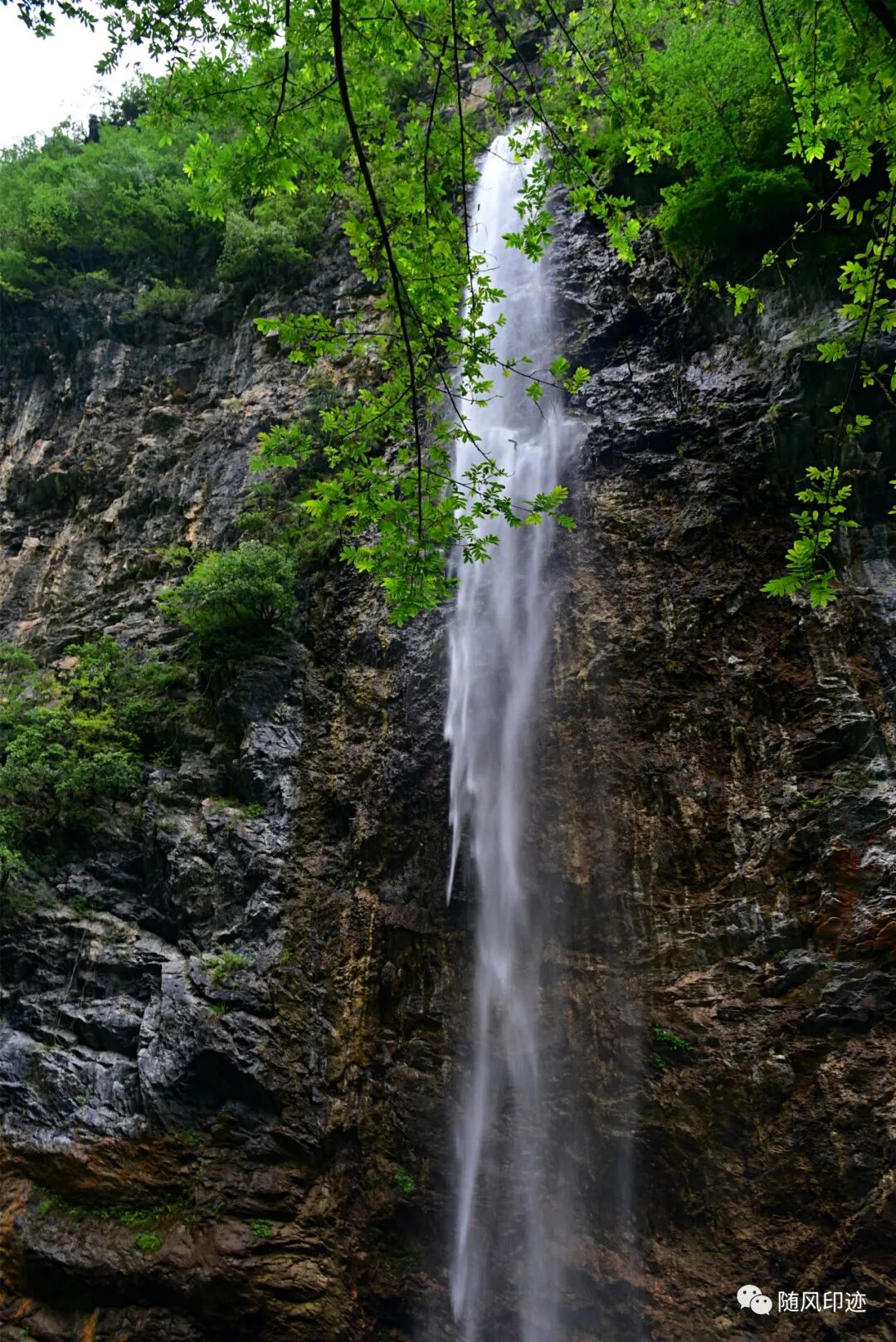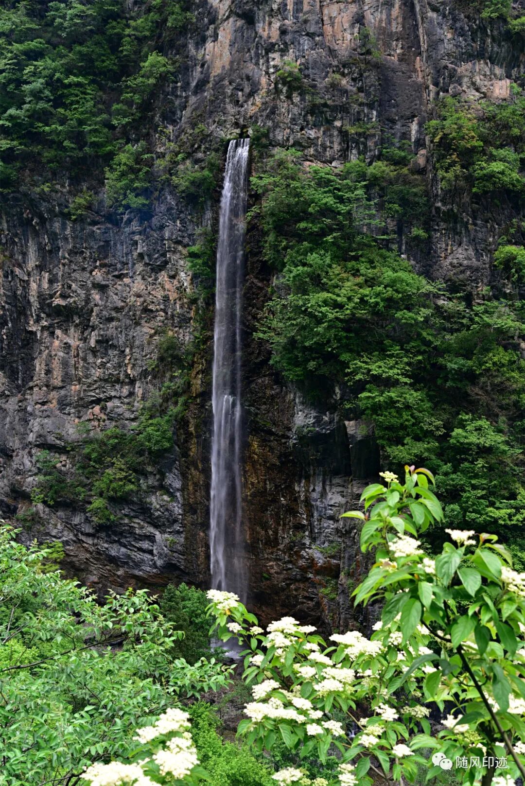 飞瀑挂崖壁,山水交相融。