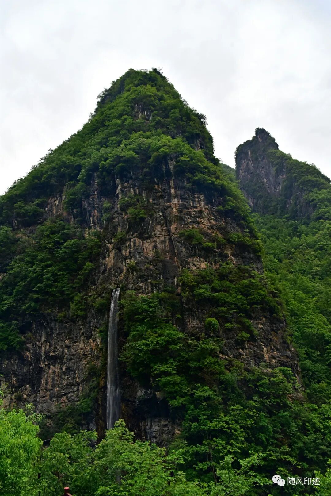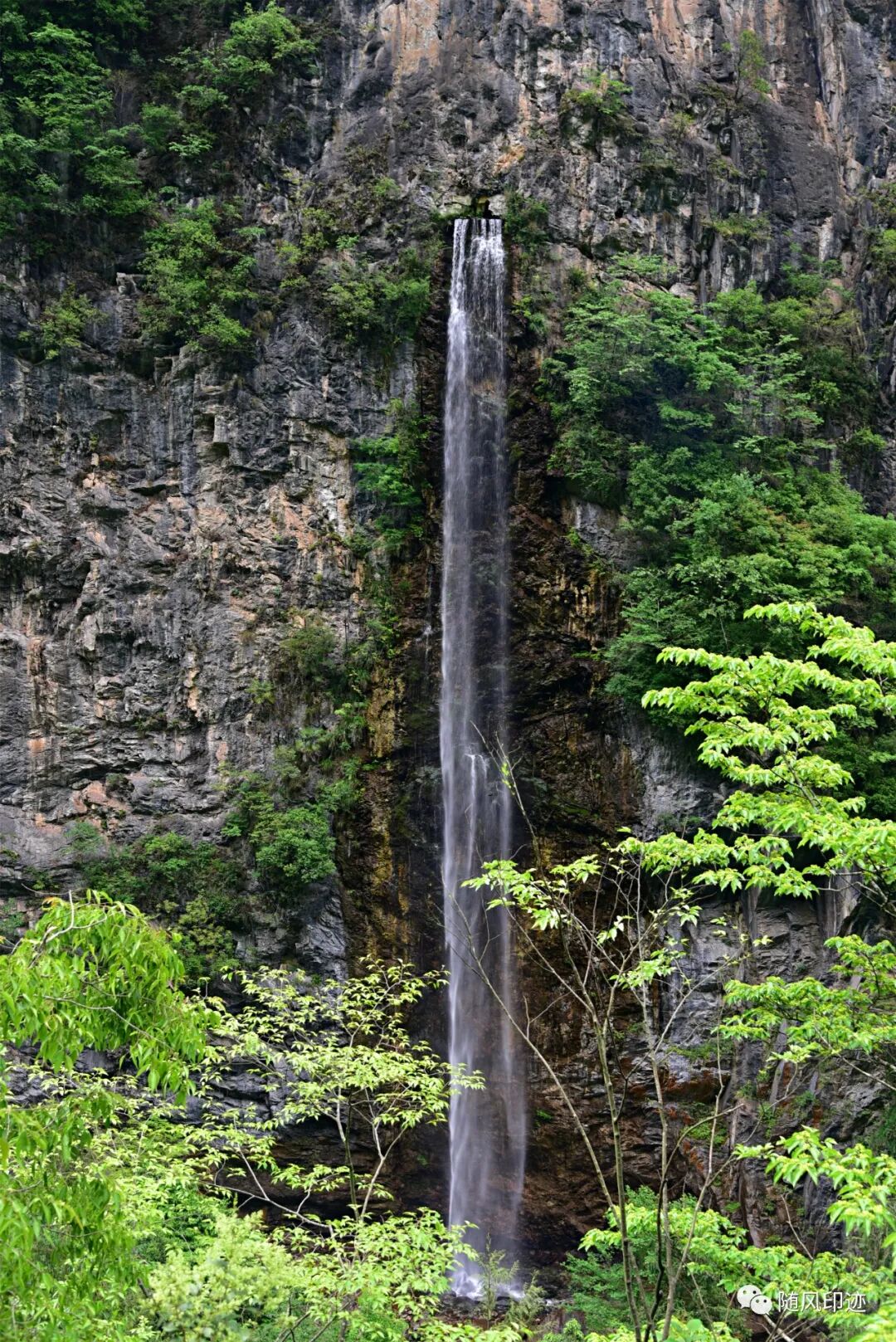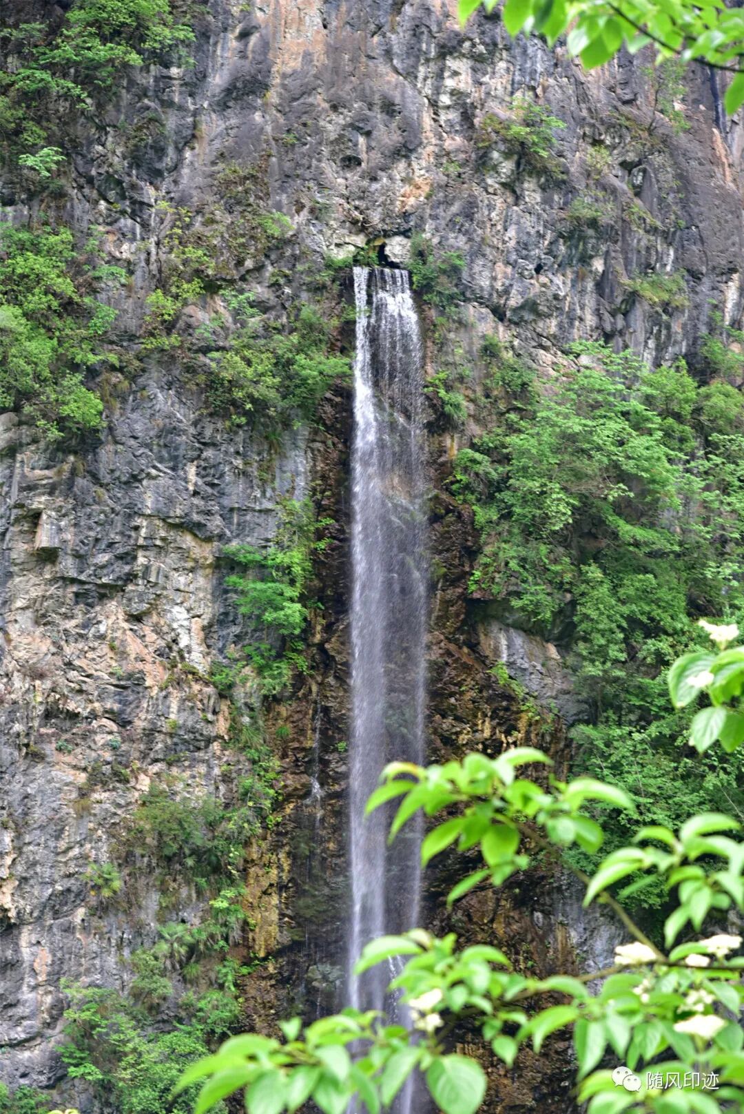 下车后到峡谷边观景台便见到一道挂在悬崖上的瀑布,有数十米高,从一小洞中流出,很像是人工瀑布,要是天然的,那就很奇特了。