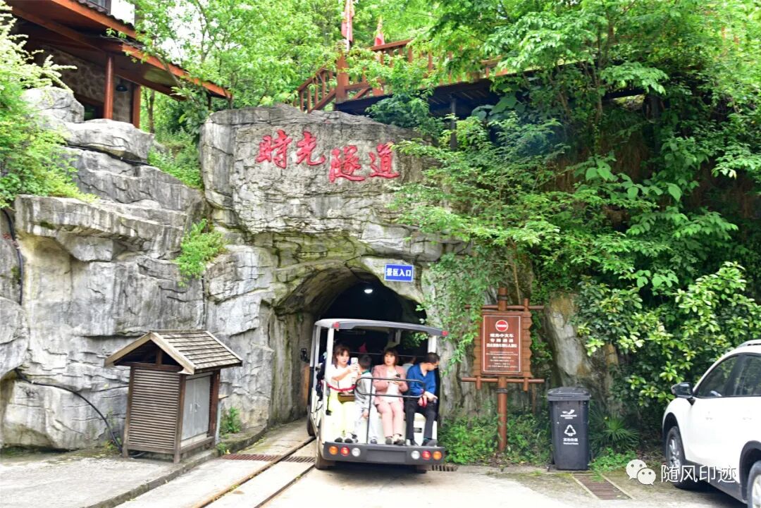 门票单买45元,我们扫脸进入。景区藏在山间,面积不大,总共也就八百多亩,没有道路与外界相通,除非走峡谷或爬山出去。到景区里必须要坐车,有小火车和观光车,要通过全长1700米的时光隧道进入,单向行驶。人少就坐观光车,大概五六分钟,小火车咣咚咣咚要开12分钟,有点意思,进去后仿若另外一个世界。