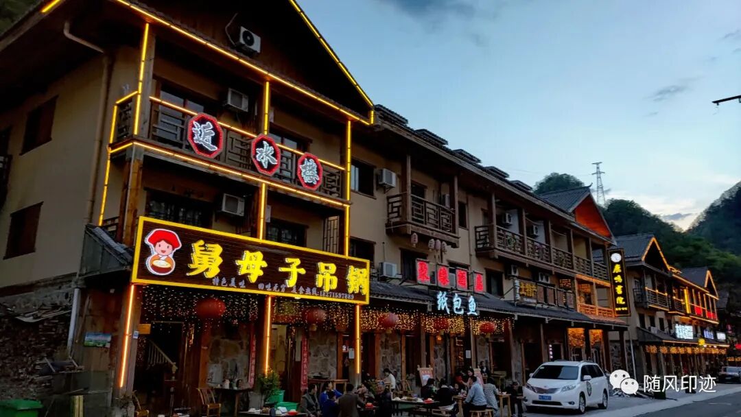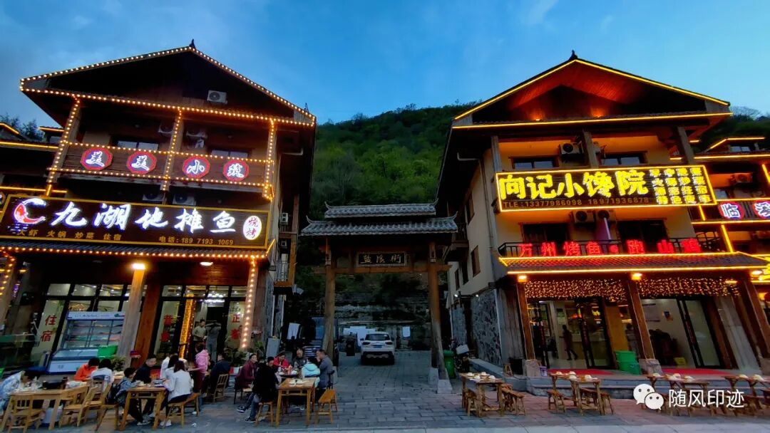 安顿好住宿后,大家步行到古镇内找饭吃,顺便看看古镇风景。历史上这里是川盐入卾的必经之路,马帮挑夫涉水跋山,肩担背扛,露宿风餐,输出山珍,贩来岩盐。坪阡古镇按照“川陕驿站、盐道水街”的定位,以“盐道”“兵我”和“水街”历史文化为重要建设元素,民居融合了川、陕、鄂、渝、湘等民居特色,系新荆楚风格。镇中间是一条河,两边是商铺和农家乐,感觉有点类似于川西的小镇。