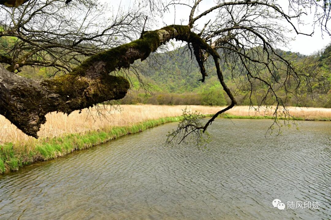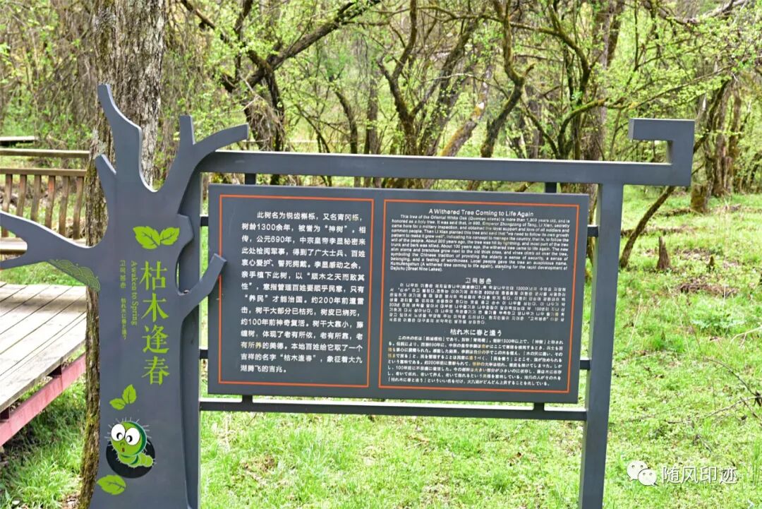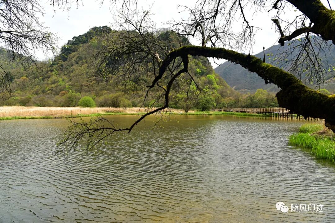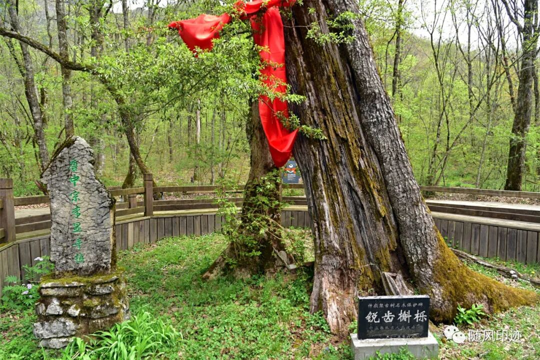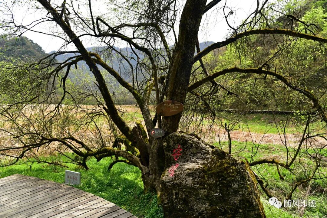 九湖湿地最里面就是唐中宗李显亲手种植的一棵青冈栎(锐齿槲栎)了,树龄已经1300多年了,树干曾遭雷劈大部分已经干枯,但100多年前另一小半却复活,生机勃勃,实乃奇迹,故名枯木逢春。