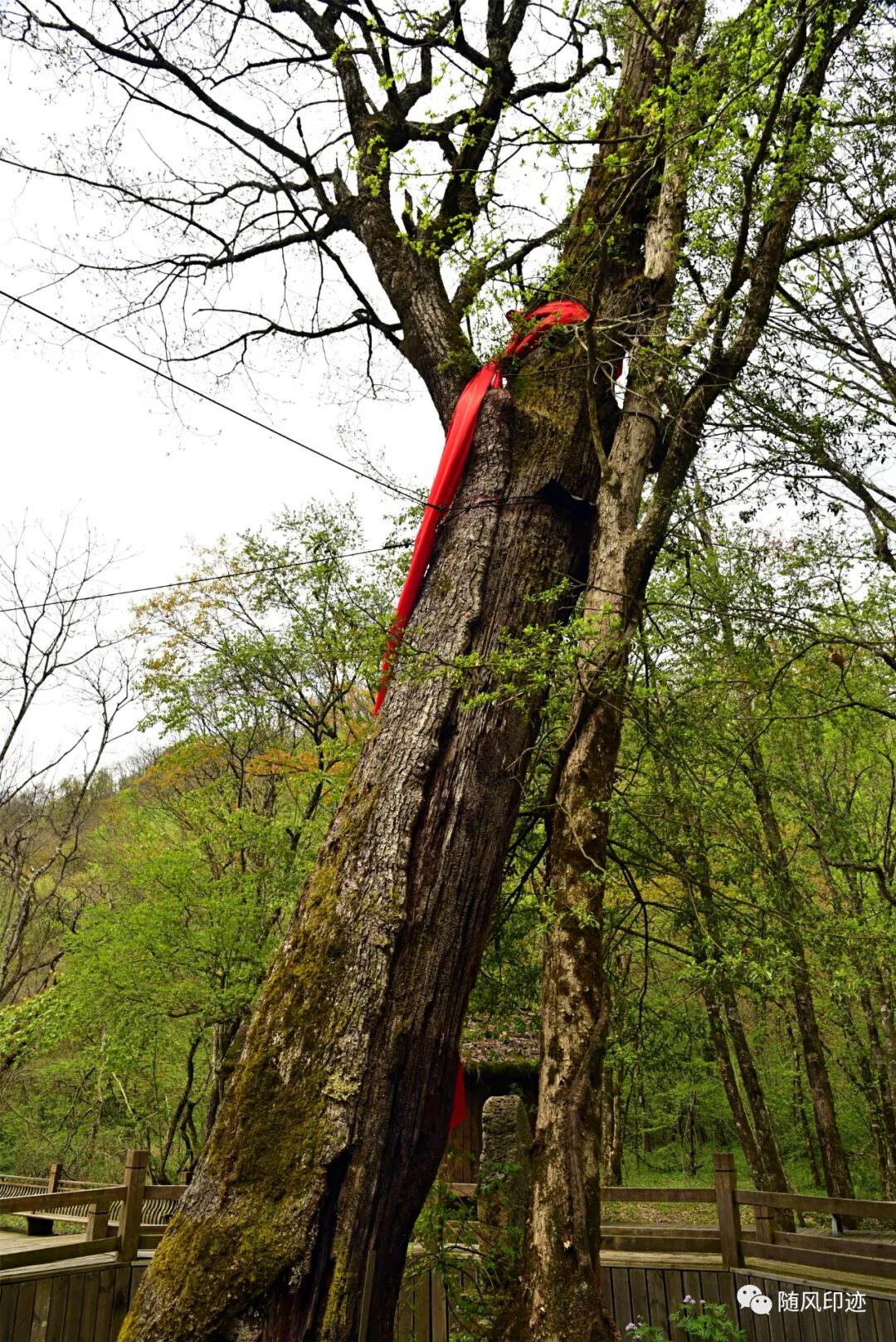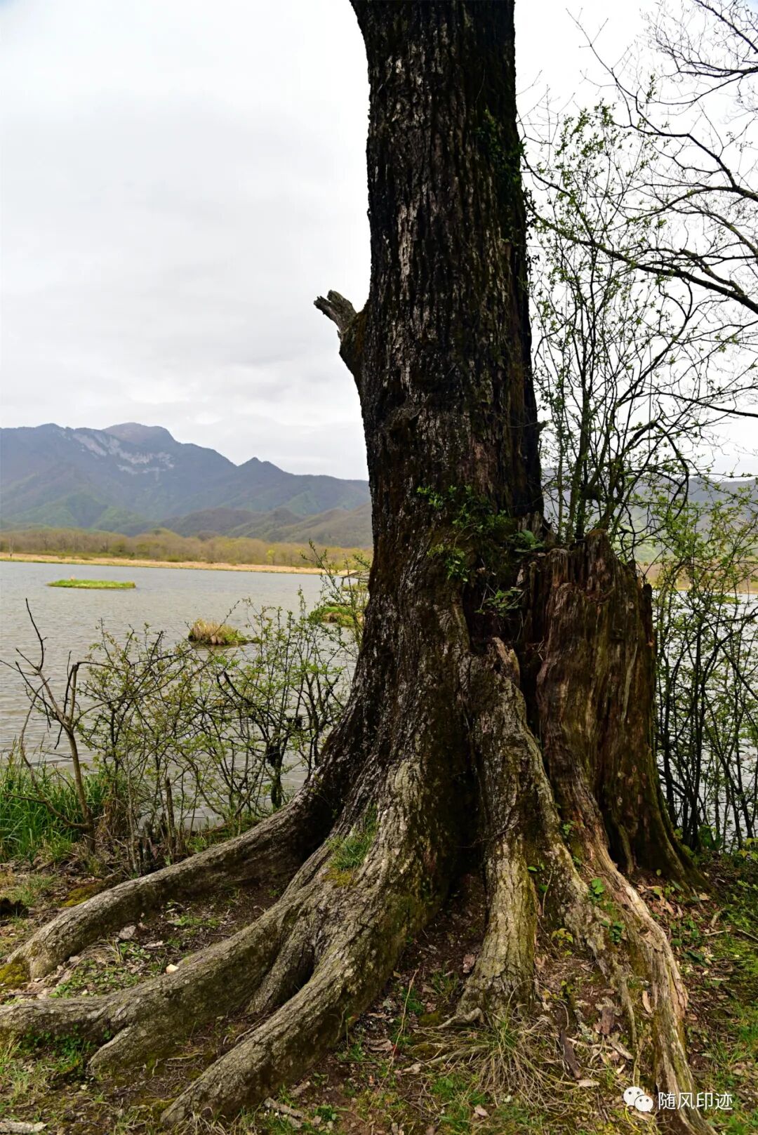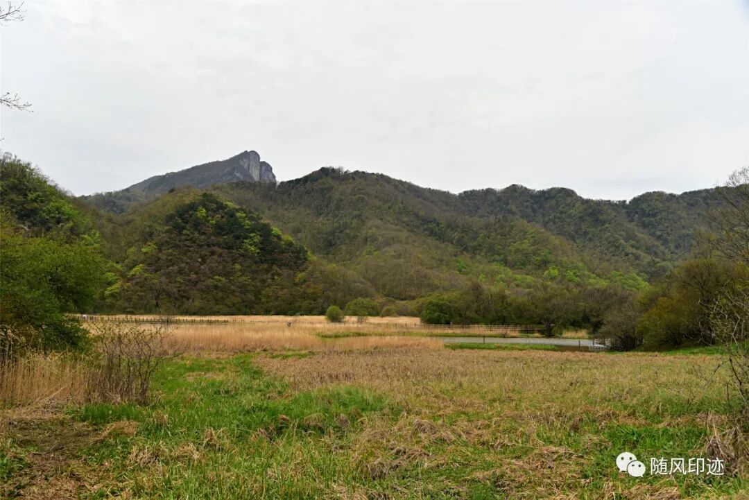 九湖湿地最里面就是唐中宗李显亲手种植的一棵青冈栎(锐齿槲栎)了,树龄已经1300多年了,树干曾遭雷劈大部分已经干枯,但100多年前另一小半却复活,生机勃勃,实乃奇迹,故名枯木逢春。