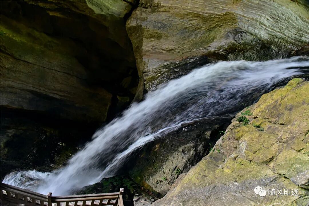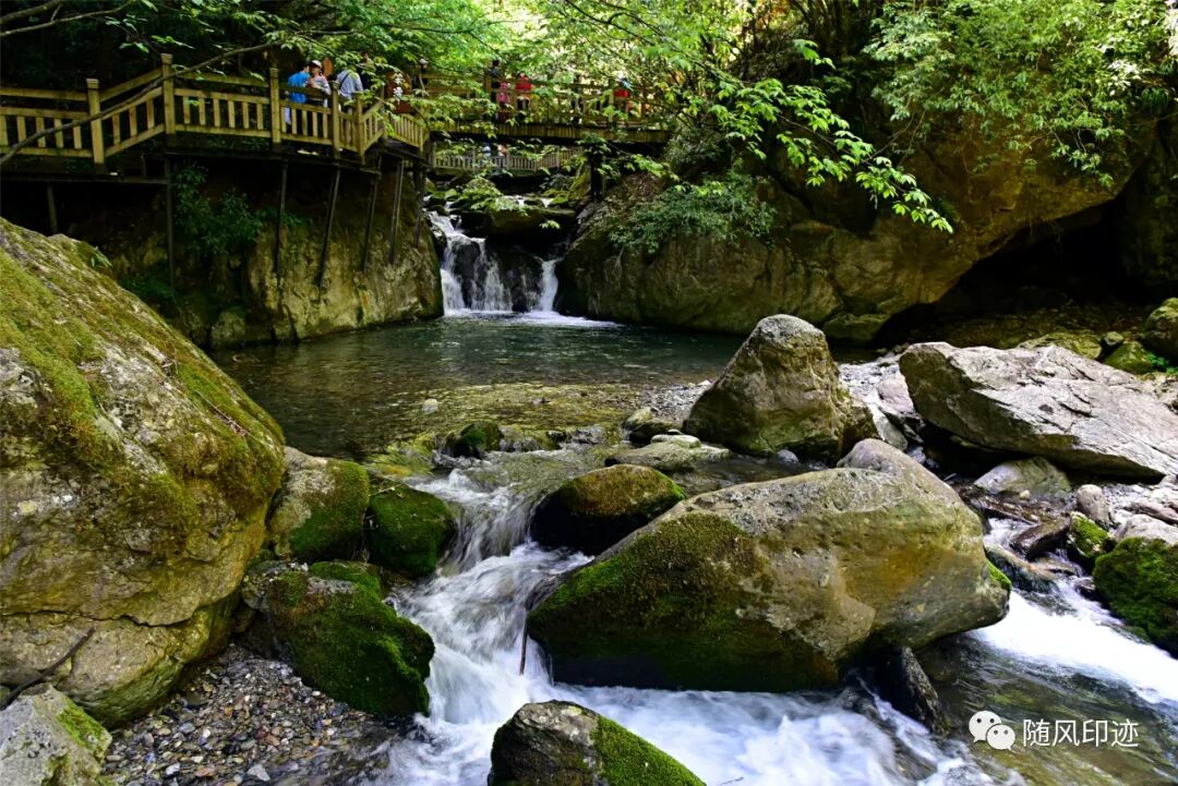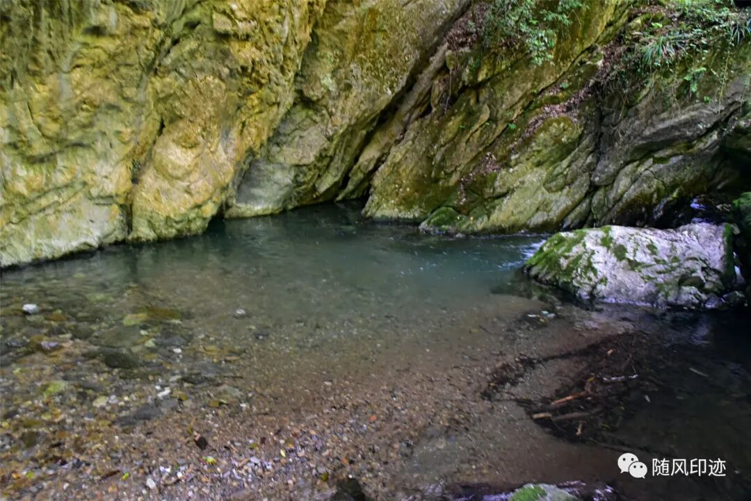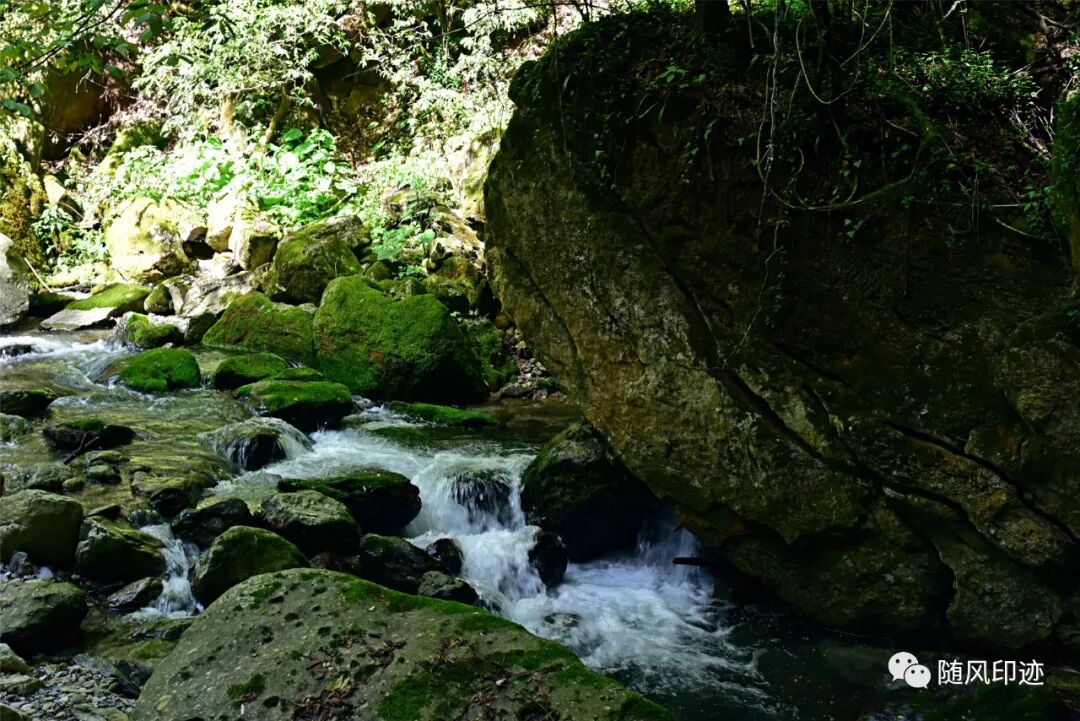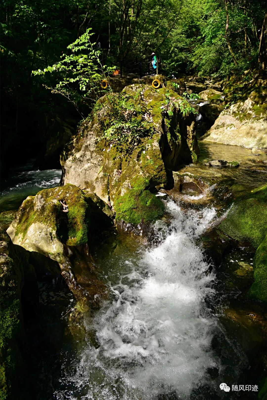 沿着宽约80cm的石壁栈道蜿蜒而上,穿过桥洞之后,地势豁然开朗,峡谷两岸绿树成荫,巨石横卧,密布青苔,仿若绿野仙踪。