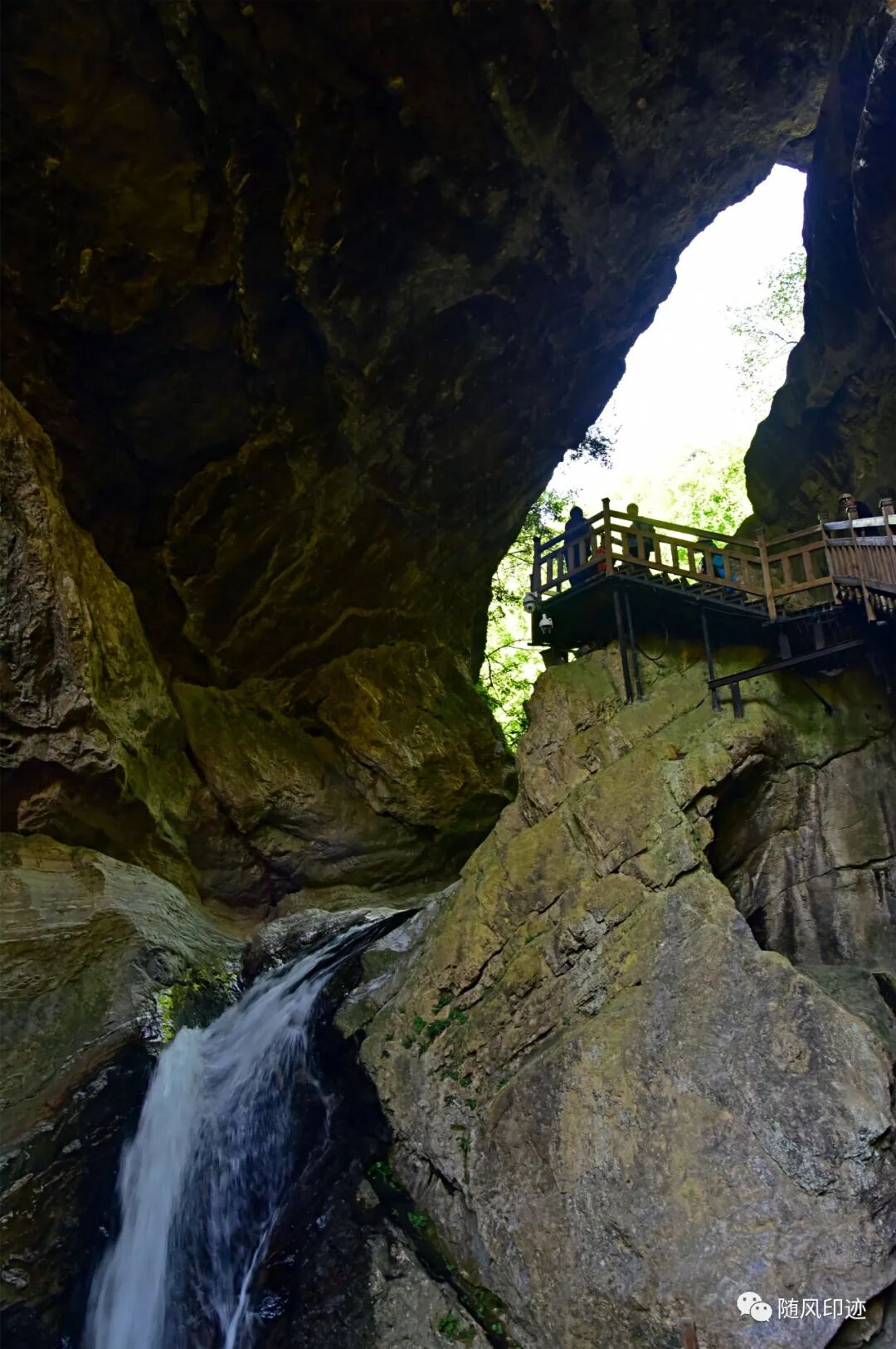 岩隙飞瀑旁,就是一座高高的天生桥。天生桥是喀斯特地貌中一种特有的景观,是可溶性的岩石的下部受流水溶蚀而形成的拱桥状地貌。桥内石壁旁有栈道通往桥内的峡谷秘境。