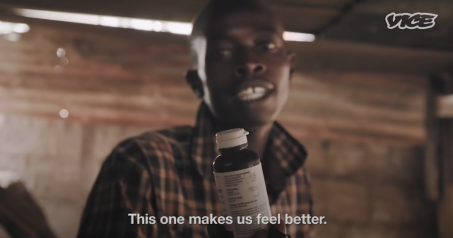 其实一瓶止咳糖浆中的可待因含量最少可以让人兴奋4-6个小时,但是非洲那些上瘾的年轻人很容易一口气喝下一整瓶甚至更多,一天得喝下三四瓶都不嫌多。