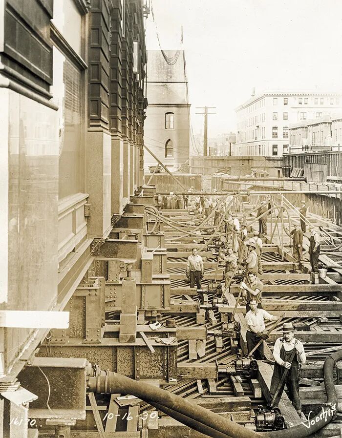 他们只把大楼抬起了0.65厘米,然后在混凝土垫下面放上俄勒冈州杉木作为滚轮,有些地方的数据显示,总共用掉了75吨杉木(历史太久远了,很多数据都不是特别准确)。