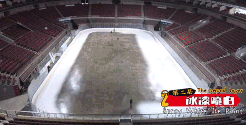 之后是给冰面喷白和画上logo这些,最后才是表面冰,不同的比赛项目对冰面要求是不一样的。