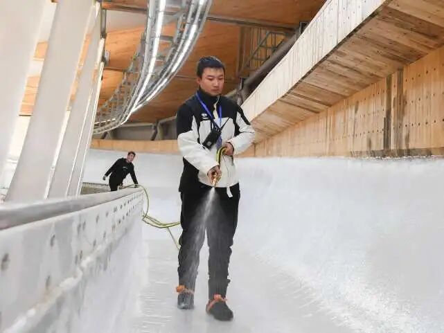 要做到这些,制冰师们必须匀速、均匀地洒水,精准控制整个赛道的洒水时间,不然就会出现有些地方水多了冰面太厚,或者水少了就会太薄。