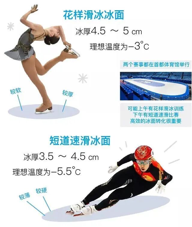 比如,这次北京冬奥会的短道速滑和花样滑冰,两个项目都在首都体育馆,但是花样滑冰对冰面厚度的要求是4.5-5厘米,而短道速滑是3.5-4.5厘米,这需要制冰师在比赛间隙进行调整。