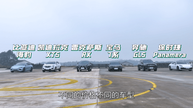 这次车辆的六款车分别是,保时捷Panamera,奔驰GLS,宝马7系,雷克萨斯RX,比亚迪海豹,以及凯迪拉克XT5。