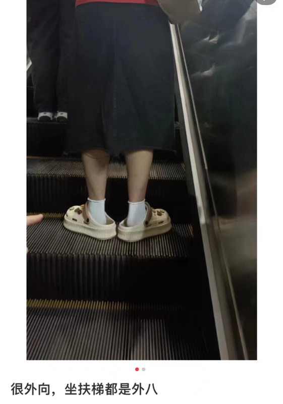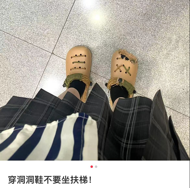 无独有偶,近日很多洞洞鞋爱好者也纷纷发帖,分享自己的洞洞鞋被扶梯“吃掉”的经历,并呼吁“穿洞洞鞋不要坐扶梯”,如果一定要坐,请远离小黄线,以外八的姿势站立。