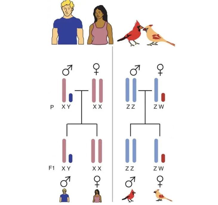 因为只有雌性鸟类能够提供不同的性染色体,所以性别是由雌性决定的,而在人类中正好相反,人类是男性拥有两条不一样的性染色体XY。