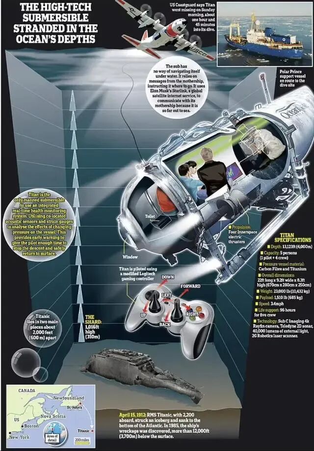泰坦号是OceanGate公司联合其他机构开发建造的,长6.7米,重达10.4吨,和一辆大卡车差不多大,外形像蚱蜢,前端有一个圆形的透明窗口,可观察外面的海洋,里面是有厕所的。而舱内空间比较狭小,五个人几乎只能盘坐在舱里。