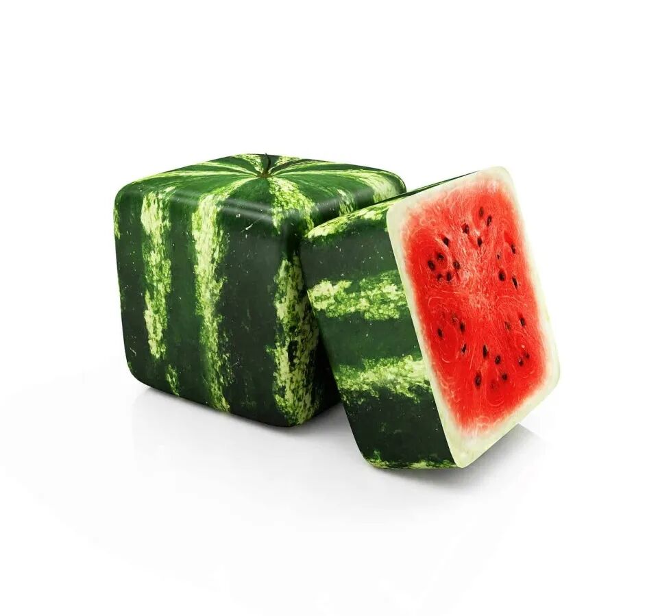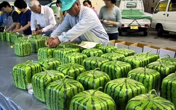 瓜农准备一些透明的盒子,比西瓜体积略小一些,在西瓜还没有完全成熟之前,就给它套上,长着长着就变成方形的了。
