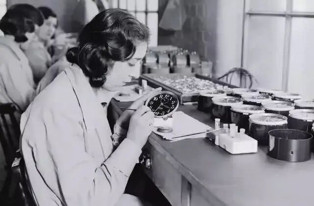 将发光涂料涂在仪表盘上,是一个精细活,因此夜光表厂的工人几乎都是女性。