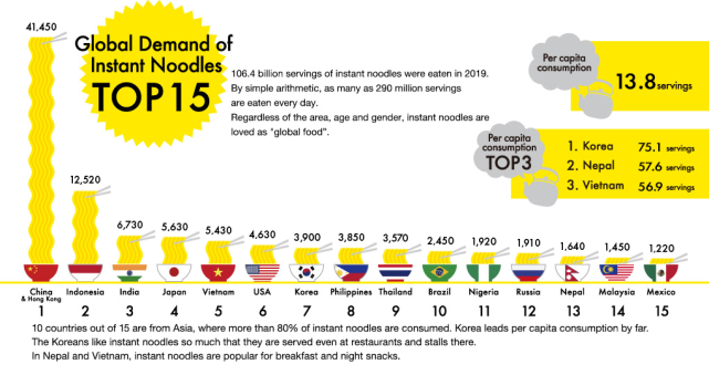 方面便消耗大国的前15名中,有10个国家来自亚洲,总销量遥遥领先的是中国,年销售414亿份泡面,但由于中国人口多,人均消费量远远比不上泡菜国。