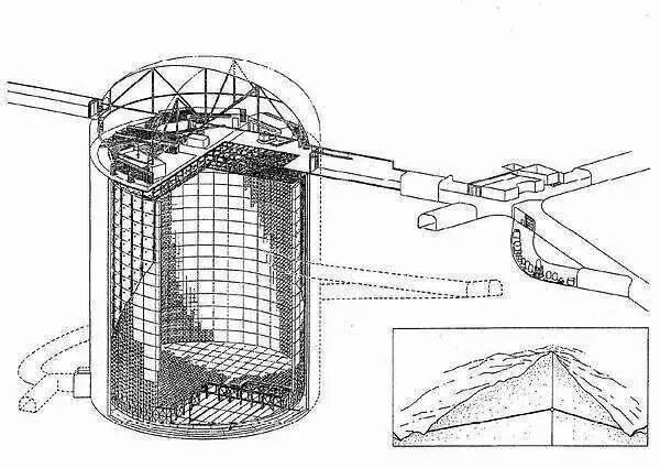 “日本大水缸”——超级神冈探测器,埋在山下1000米深处,这个设备高41.1米,直径39.3米,相当于15层楼高的建筑物。在这个水箱内装满了50000吨超纯水。