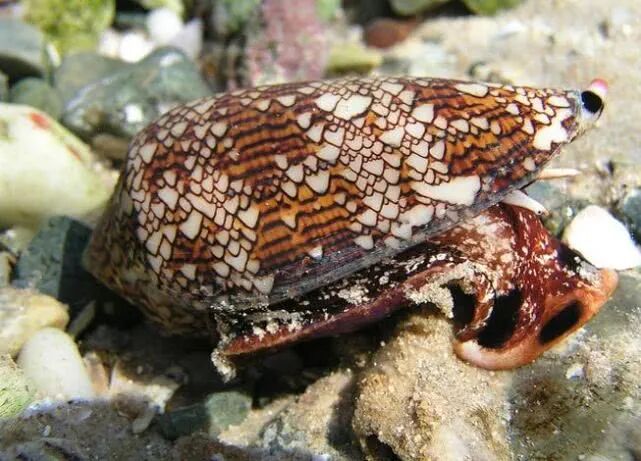 锥形蜗牛,又叫鸡心螺,主要分布在热带海域,世界上有500多种鸡心螺,别看它们小小的,不过几厘米长,它们的毒性非常强。